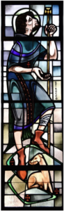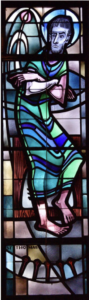 Perhaps Father Mulroy couldn’t install a specific donor plaque at the base of each window, because after construction began, it was discovered that there wouldn’t be room for eight windows on each side—as was originally planned. Instead, the south side of the nave would need to have ten windows and the north side of the nave would have seven. With 17 windows funded by donors, one window would not be in the nave—it would have to be on the south wall of the narthex on the south entrance. But what saint deserved to be relegated to the one wall, not in the main body of the church?