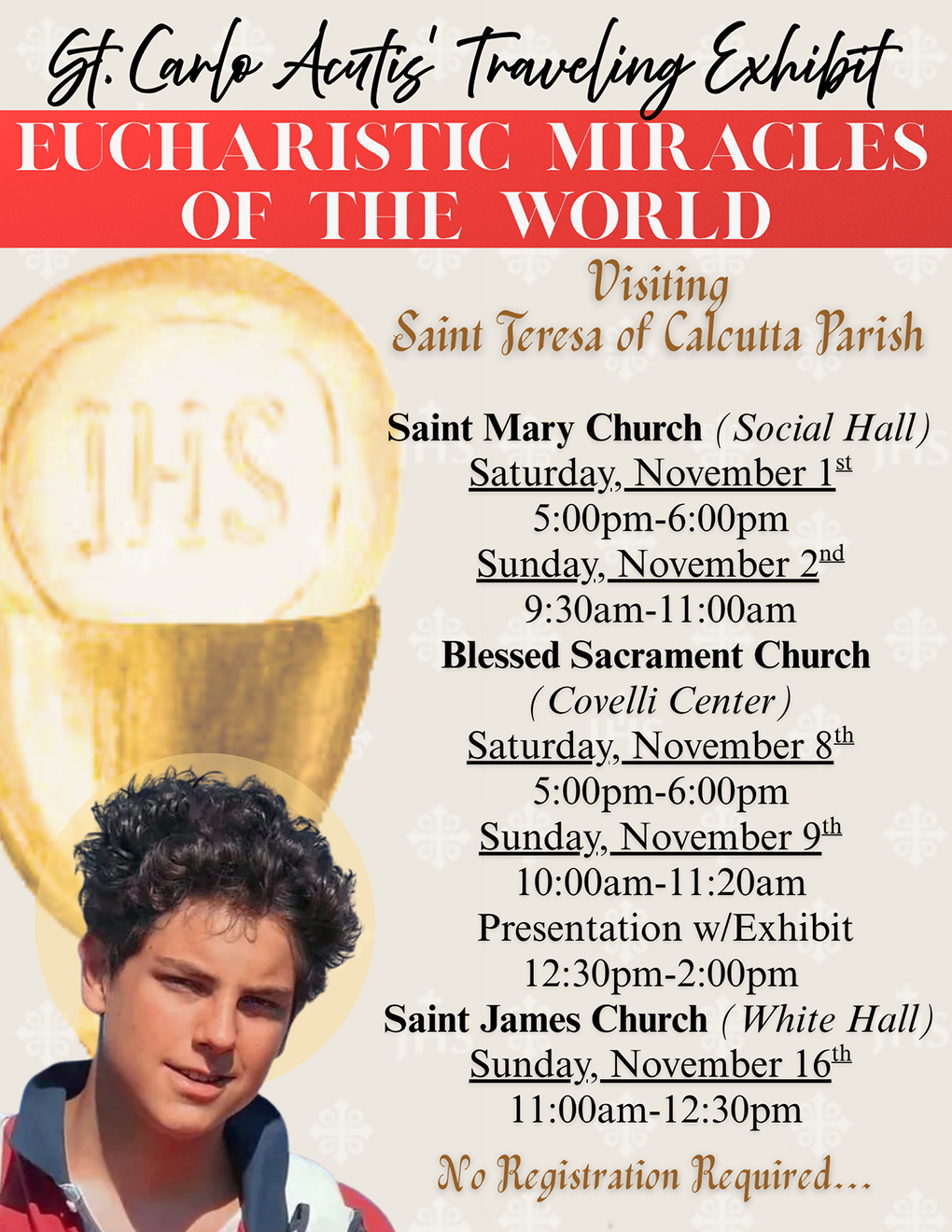 St. Carlo Acutis Traveling Exhibit Event (Eucharistic Miracles of the World) will visit Saint Teresa of Calcutta Parish for 3 separate weekends in November. The first event will take place on Saturday, November 1st from 5:00pm-6:00pm & Sunday, November 2nd from 9:30am-11:00am at Saint Mary Church (Social Hall), 232 Seneca, N.E., Warren 44481. The 2nd event will take place on Saturday, November 8th from 5:00pm-6:00pm & Sunday, November 9th from 10:00am-11:20am & a Presentation with the Exhibit from 12:30pm-2:00pm at Blessed Sacrament Church (Covelli Center), 3020 Reeves Rd., N.E. Warren 44483. The 3rd event will take place on Sunday, November 16th from 11:00am-12:30pm at Saint James Church (White Hall), 2532 Burton St., S.E., Warren 44484. There is No Registration Required.