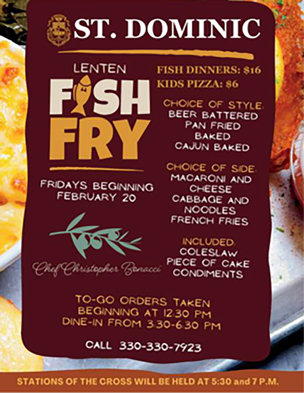 St. Dominic Parish will host fish fries at the parish hall, 77 E Lucius Ave, Youngstown, OH 44507. The menu features beer battered, pan fried, baked and cajun baked fish with a choice of sides of macaroni and cheese, cabbage and noodles and french fries. Also included in each meal is coleslaw, piece of cake and condiments. Fish Dinners: $16, Kids Pizza: $6. To-Go Orders Taken Beginning at 12:30 PM & Dine-In from 3:30-6:30 PM. Call 330-330-7923. For other fish fries, visit the Fish Fry Directory online at: www.CatholicEcho.org/Fish-Fry-Directory-2026/.