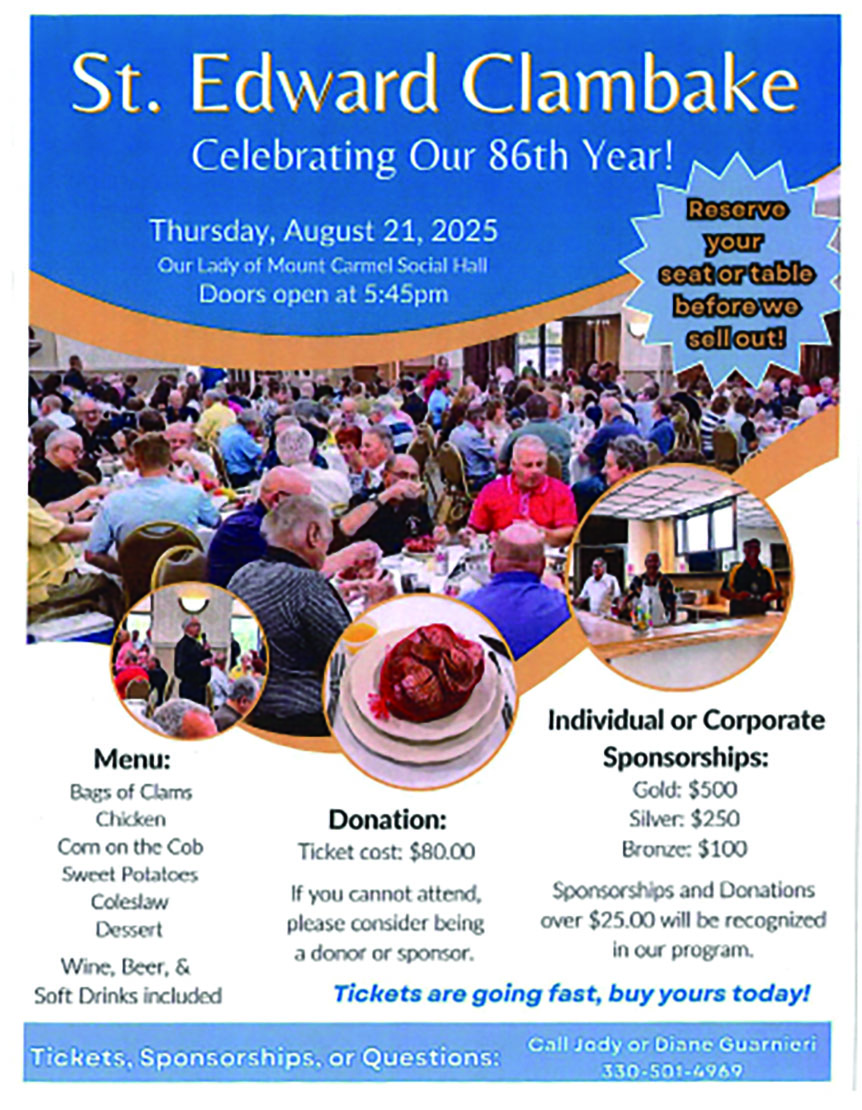 To celebrate our 86th year, St. Edwards will be holding their Clambake at Our Lady of Mount Carmel Social Hall, 343 Via Mt. Carmel, Youngstown. Doors open at 5:45 pm. Donation: Ticket cost: $80.00. If you cannot attend, please consider being a donor or sponsor. Tickets, Sponsorships, or Questions, call Jody or Diane Guarnieri at 330-501-4969.