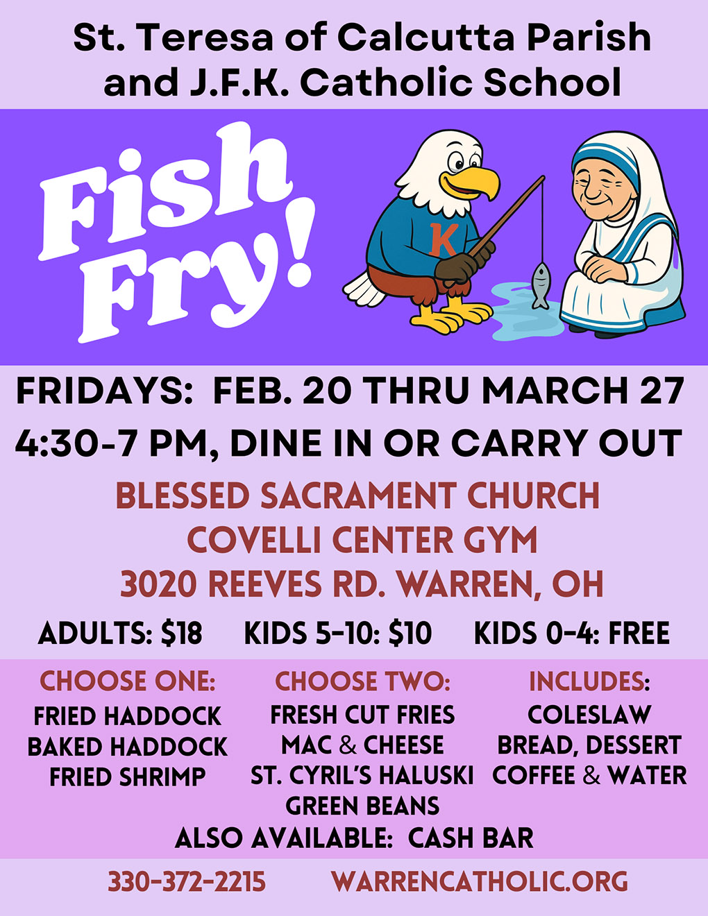 St. Teresa of Calcutta Parish and J.F.K. Catholic School will host fish fries at Blessed Sacrament Church in the Covelli Center Gym, 3020 Reeves Rd., Warren, OH. Dine in or Carry out. The menu features a one choice of fried, baked haddock or fried shrimp with a choice of two sides of fresh cut fries, mac & cheese, St. Cyril’s haluski or green beans. Included in each meal is coleslaw, bread, dessert, coffee and water. Also available is a cash bar. Adults: $18, Kids 5-10: $10, Kids 0-4: FREE. Call 330-372-2215 or go to warrencatholic.org. For other fish fries, visit the Fish Fry Directory online at: www.CatholicEcho.org/Fish-Fry-Directory-2026/.