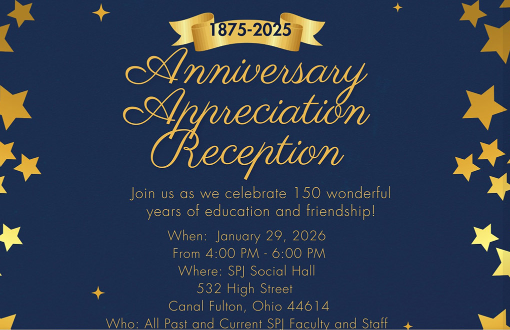 Sts. Philip and James is hosting an 150th Anniversary Appreciation Reception at the SPJ Social Hall, 532 High Street, Canal Fulton, Ohio 44614. We will celebrate all Past and Current SPJ Faculty and Staff.
