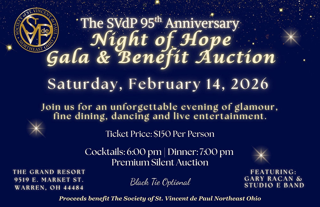 The SVdP 95th Anniversary Night of Hope Gala & Benefit Auction hosted by The Society of St. Vincent de Paul Northeast Ohio will be held at The Grand Resort, 9519 E. Market St., Warren, Ohio 44484. There will be Cocktails at 6:00 pm & Dinner at 7:00 pm. Ticket Price: $150 per person. There will be a Premium Silent Auction and entertainment featuring Gary Racan & Studio E Band. Black Tie Optional. For questions about the event or tickets, please call (234)223-2933 or email mhilton@svdpneodistrict.org. Proceeds benefit The Society of St. Vincent de Paul Northeast Ohio.